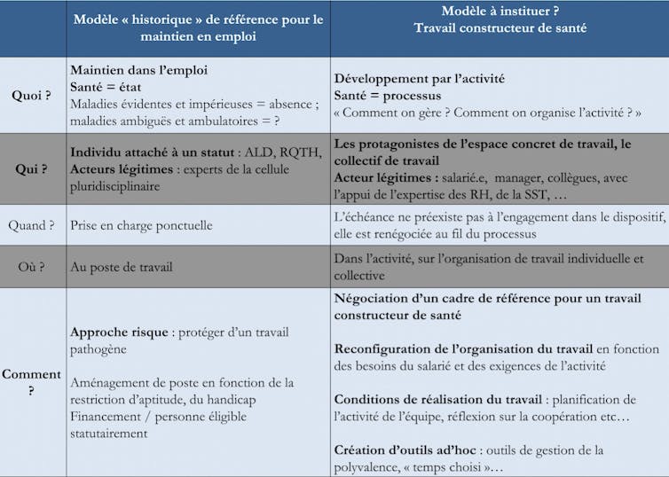 Quel nouveau modèle de maintien au travail permettrait alors de dépasser ces limites ? Pour réfléchir à ses contours à partir des expériences de terrain et de modèles étrangers inspirants, nous avons imaginé « une table de passage » pour mettre en évidence ce qui, terme à terme, distingue le modèle en vigueur (à gauche dans le tableau) d’un nouveau modèle à inventer (à droite donc).